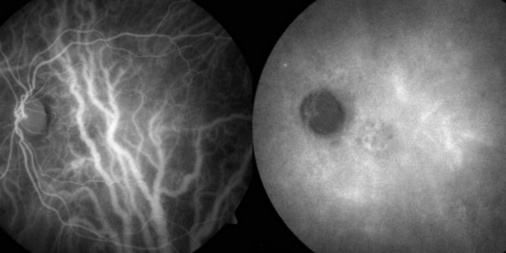 São realizadas imagens do fundo de olho. Com a passagem do contraste é possível a observação detalhada dos vasos sanguíneos.